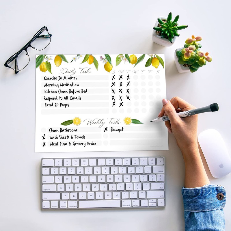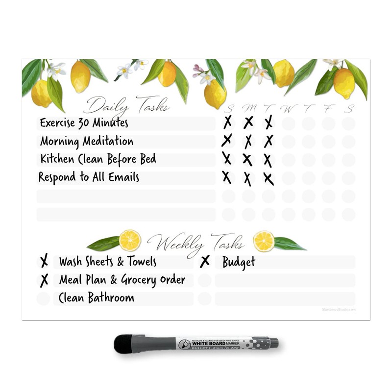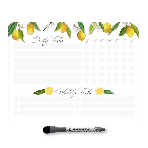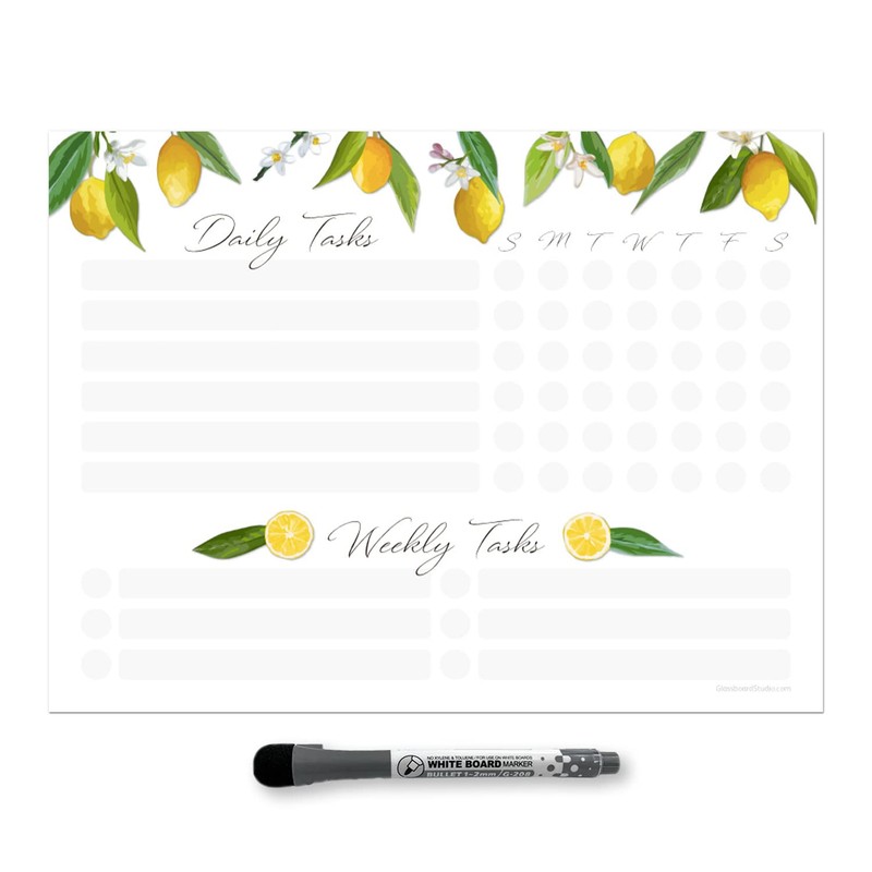 Dry Erase Whiteboard Task Planner | Removable and Restickable Adhesive Decal | Fine-Tip Magnetic Marker Included (9 x 12 inches, Lemon)
