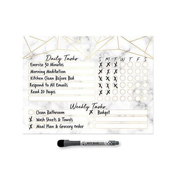 Dry Erase Whiteboard Task Planner | Removable and Restickable Adhesive Decal | Fine-Tip Magnetic Marker Included (9 x 12 inches, Marble)