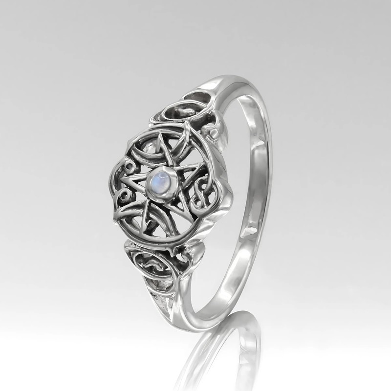 Discover the enchanting symbolism of our Sterling Silver Heart Pentagram Ring. This exquisite piece of Wiccan jewelry combines a pentagram symbol with the heart, representing the balance of spirit and emotion. Adorned with a mesmerizing rainbow moonstone, this ring also has two crescent moons capturing the magic of the lunar cycle, symbolizing intuition, wisdom, and inner strength. Crafted with meticulous attention to detail, this ring is not only a stunning accessory but also a meaningful talisman. Embrace the power of your heart and connect with the cosmic energy with our Heart Pentagram Ring.