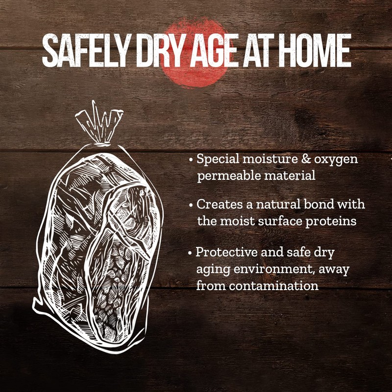 • SAFE AND INEXPENSIVE MEAT AGING: We make dry-aging meat at home a simple process - without expensive equipment! Our superior moisture- and oxygen-permeable material is breathable and creates a natural bond with the steak's moist surface proteins. The meat bags form a protective and safe, dry-aging environment, away from contamination.