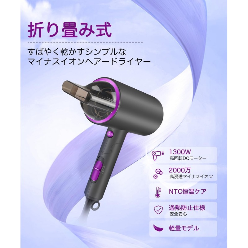 Dryer (2023 Evolved Model) Large Airflow, Quick Drying, Ultra Lightweight, Popular, Ranking 1,300 W, Foldable, Portable Dryer, Negative Ions, 3 Levels of Airflow, Small, Includes Nozzle, Overheating Prevention Function, For Home, Salon, Travel, PSE Certified