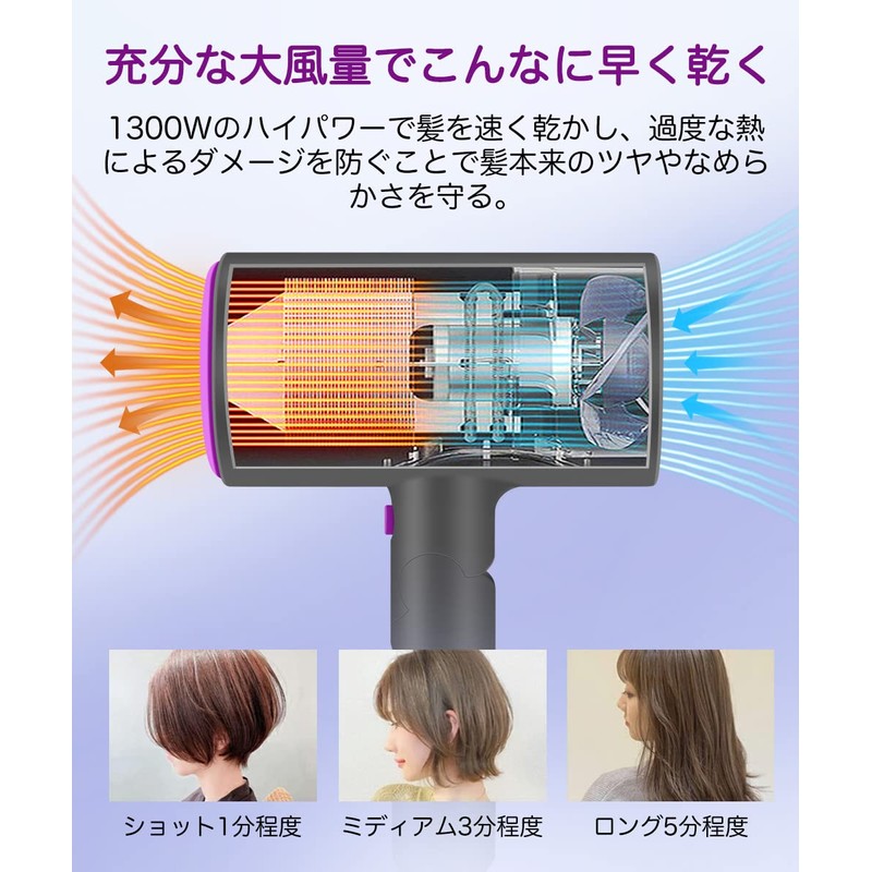 - 1,300 W Air Flow That Dries Quickly: This hair dryer is equipped with a powerful 1,300 W motor, so the air flow is up to 2.26 m³/min, and the air flow is up to 14.3 m/s. Compared to the 1,800 W hair dryer, it has a large amount of electricity consumption, and can be switched to suit your needs. It also has a cool wind switch. Equipped with a built-in switch, you can quickly switch between hot and cold air