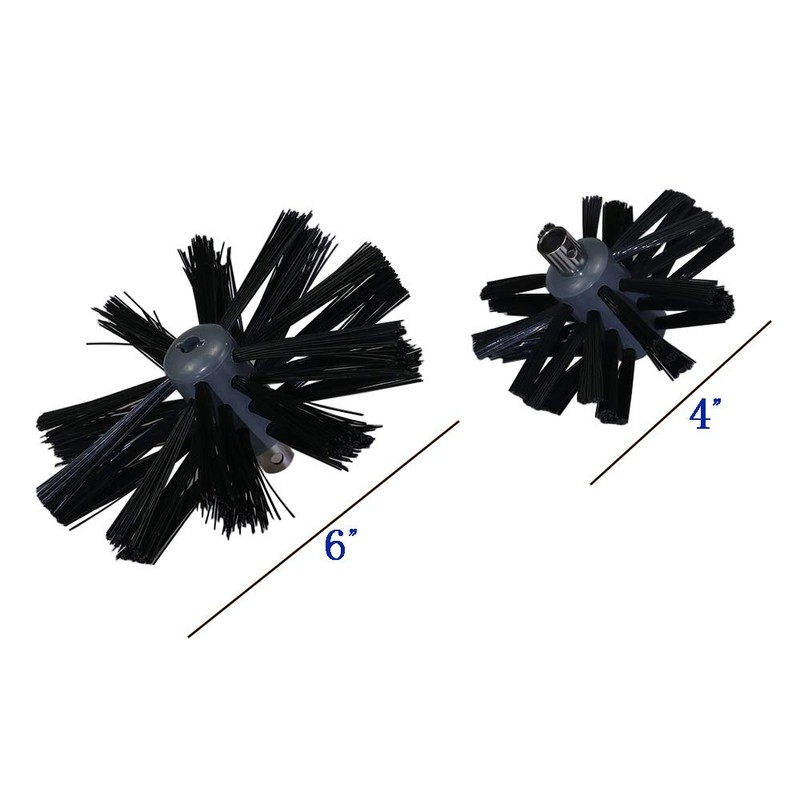 The kit comes with 2 brush heads, the one 4” in diameter usually used for dryer vent, and the one 6” for chimney.