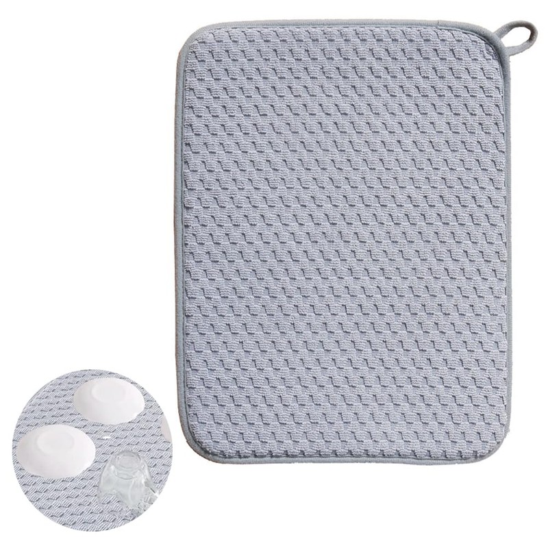 - Super Absorbent: The gray dish drying mat is made of microfiber. 11.8 x 15.7 inches (30 x 40 cm) large size countertop drying pad can hold more cookware. And it quickly absorbs water under balls, dish shelves, cutlery, and cups