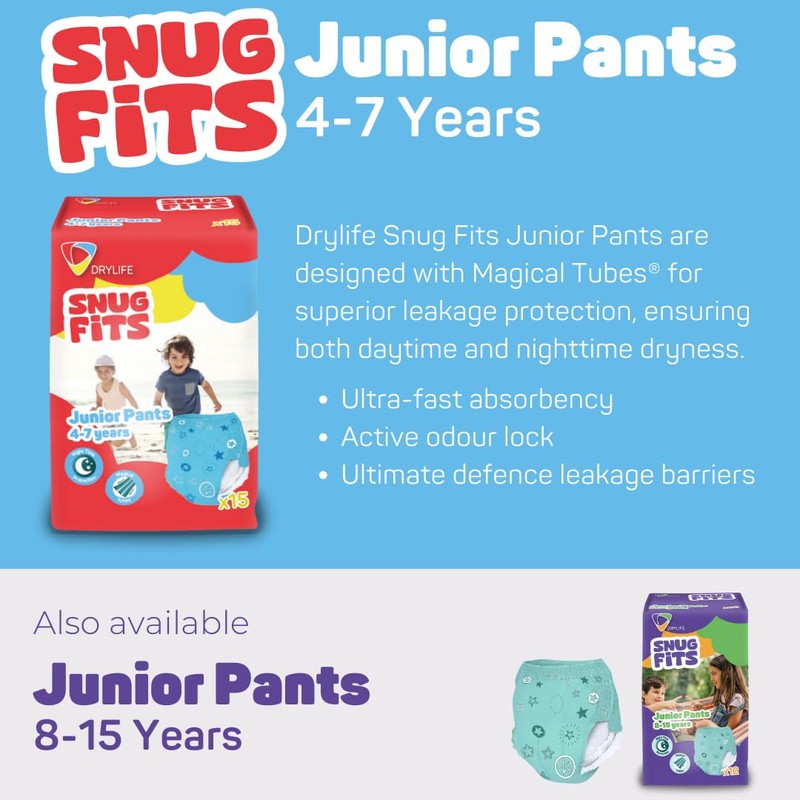 Drylife Snug Fits Unisex Ganztägig & Nachtwindeln bei Bettnässen | 800 ml Saugfähigkeit - 4-7 Jahre - 17-30 kg (15 Stück)