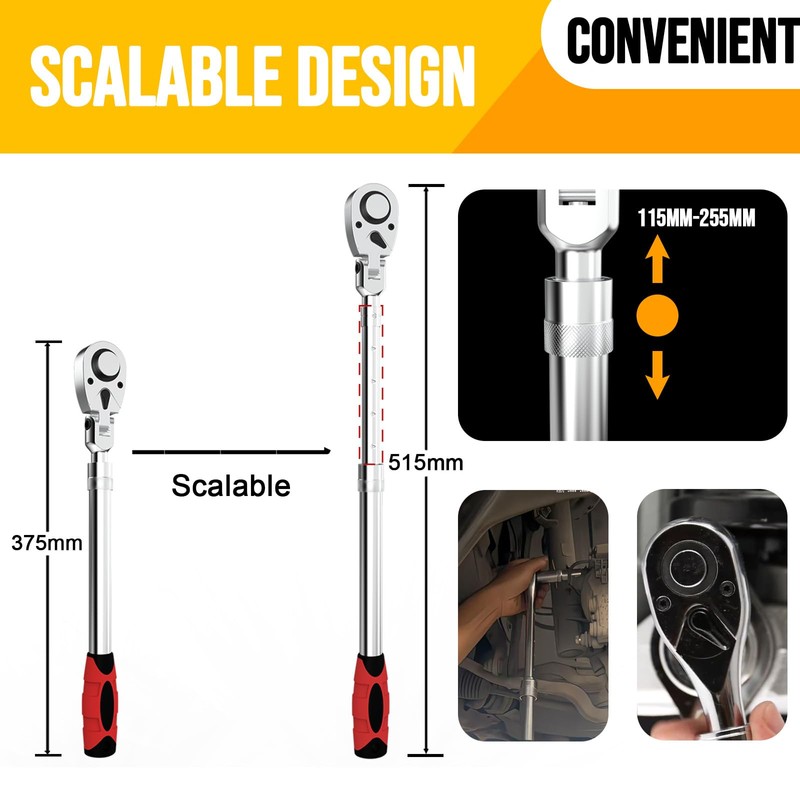 - 【Extendable design, suitable for various scenarios】 The length can be freely adjusted between 375mm (retracted) and 515mm (extended), easily handling bolts of different depths and angles. The extendable range is 115mm-255mm, accommodating both compact spaces and long lever requirements.