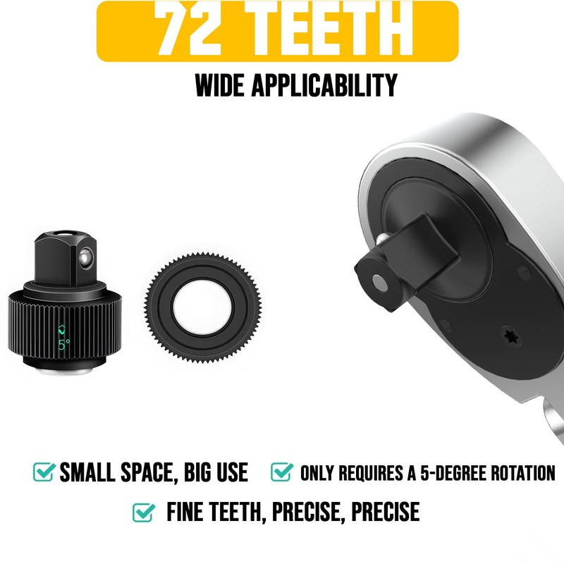 - 【72-tooth precision ratchet, 5° small-angle operation】 High-density gear structure allows engagement with just a 5° micro-rotation, ideal for narrow spaces (e.g., vehicle undercarriages, engine compartments). Dual-direction (clockwise/counterclockwise) locking enables quick switching between tightening and loosening modes.