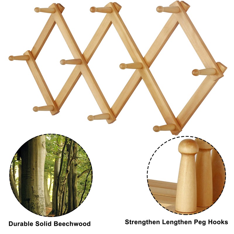 **Dseap Accordian Wall Hanger, Wall Mounted Coat Rack with 10 Peg Hooks** Material:Pine Wood Color:Natural **Dimension:** 16-inches high; Extend up to 46 inches **Package Includes:** 1* Dseap wood wall hanger **Application Scope:** Dseap accordian wall hanger is very utility to be as your coat rack wall mounted, scarf hanger, coffee mug rack, hat racks for baseball cap, and others. Besides, Dseap expandable coat hook featuring with simple and stylish look, perfect to enhance your entryway, mudroom, livingroom, bedroom, closet, kitchen, hallway and more.