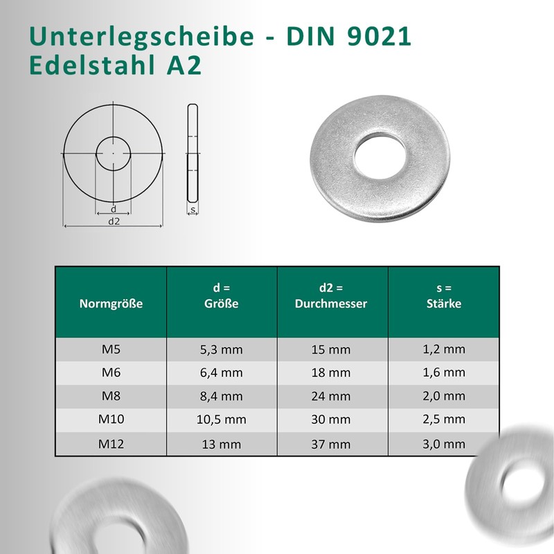 For additional protection of the material and optimised pressure distribution, washers according to DIN 9021 or DIN 125 are included. This set is ideal for wooden structures, fence and railing construction, mechanical engineering as well as numerous other mounting applications.
