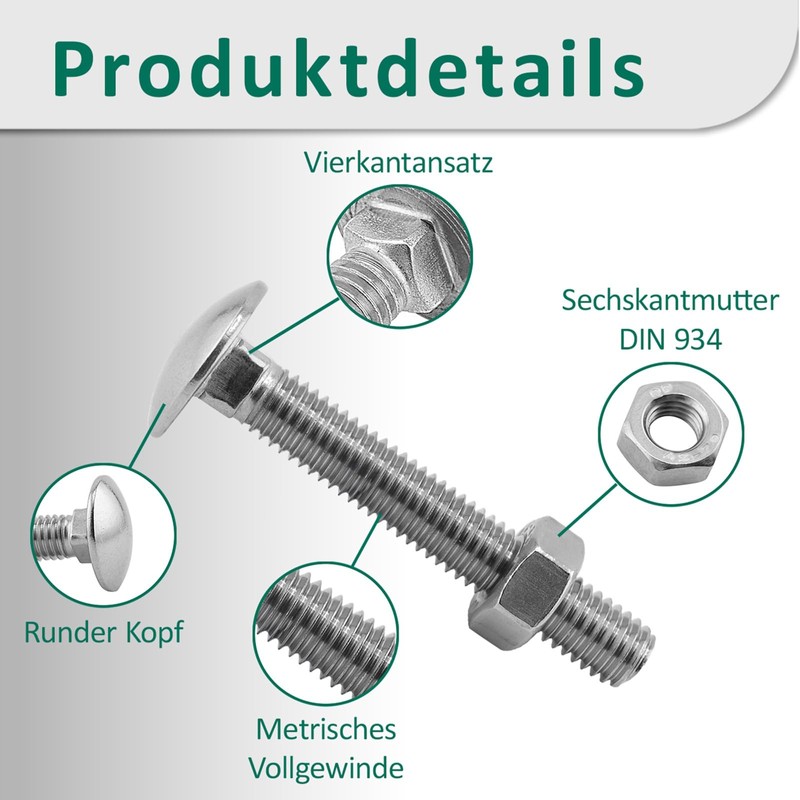 - Technical details: thread: M5 (metric, full thread). Length: 70 mm (without head). Material: stainless steel A2/V2A. Head diameter: 13.55 mm. Square dimensions: 5.48 mm. Square height: 4.1 mm. Hex nut according to DIN 934 (3.7 mm height, 8 mm spanner width, 8 mm. .79 mm Corner dimensions) | Complete set consisting of carriage bolt and matching nut | Tensile strength: 700 N/mm² | Box contents: 10 pieces.