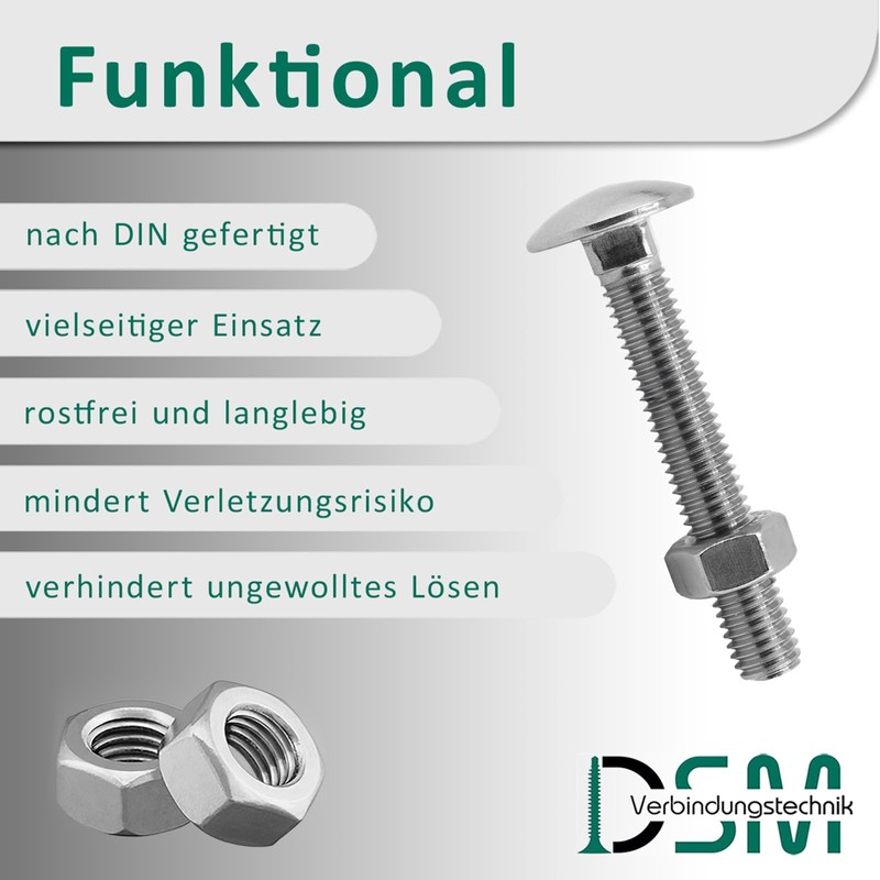 DSM - Carriage Bolts M5 x 70 mm DIN 603 - Includes M5 Hex Nut DIN 934 - A2/V2A Stainless Steel - Round Head Screws with Square Neck - Full Thread - Gate Hinge Screws - Pack of 10