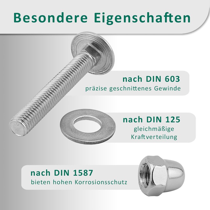 - Stable connection: the combination of carriage bolt with square neck and cap nut ensures a secure, reliable screw connection without unwanted loosening. Perfect for applications with increased safety requirements.