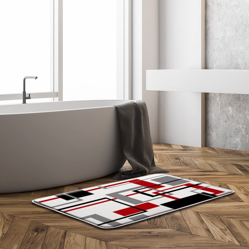 DSMEUE Red Black Geometric Bath Mat White Gray Modern Geometry Square Striped Bathroom Kitchen Rugs,17.8"x29.5"