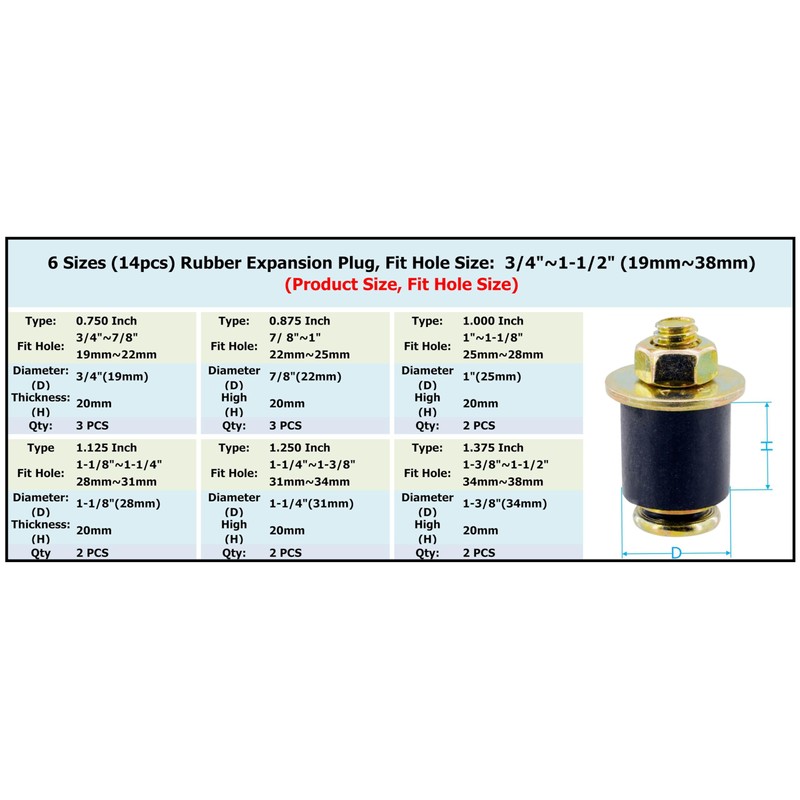 Dsnaduo 6 Sizes (14pcs) Neoprene Rubber Expansion Plug 3/4" 7/8" 1" 1-1/8" 1-...