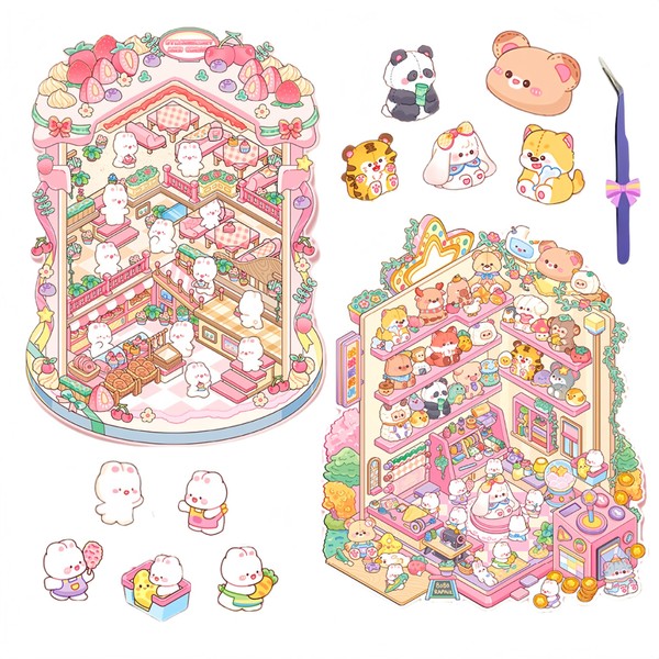 - DIY 3D House Stickers: Type A has 4+1 individually wrapped themed stickers, 5 in total: a supermarket, a coffee shop, a bookstore and a restaurant, a bunny pink dessert shop and a pair of special tweezers. These DIY scene sticker kits are ideal gifts for boys and girls.