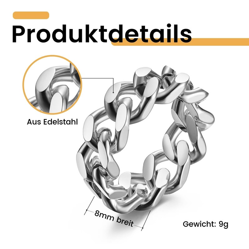 Dsnyu Men's Ring Stainless Steel Chain Simple Cuban Link Band Ring Engagement Rings 8 mm Wide Punk Fashion Jewellery Size 49 (15.6) - 67 (21.3), 不, No Gemstone