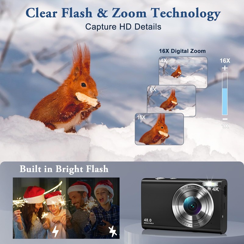 • [Perfect 4K 48MP Autofocus Camera] This digital camera uses an advanced CMOS image sensor system to capture 4K video recording and 48MP photo capture easily. 4K digital camera with autofocus makes long and macro shooting easy to ensure every detail is crisp on stills and motion. This vlogging camera is compact and user-friendly, Perfect for teens, adults, and beginners alike, and designed for photographers who value simplicity and quality.