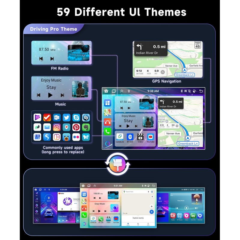 - 4.【59 UI Themes & Customize Home Page APPs 】 This camry bluetooth radio supports split-screen functionality,allowing you to use two apps simultaneously and customize the size and position of each app.Switching between apps is made easy with a simple swipe gesture.59 kinds of UIs for you to choose