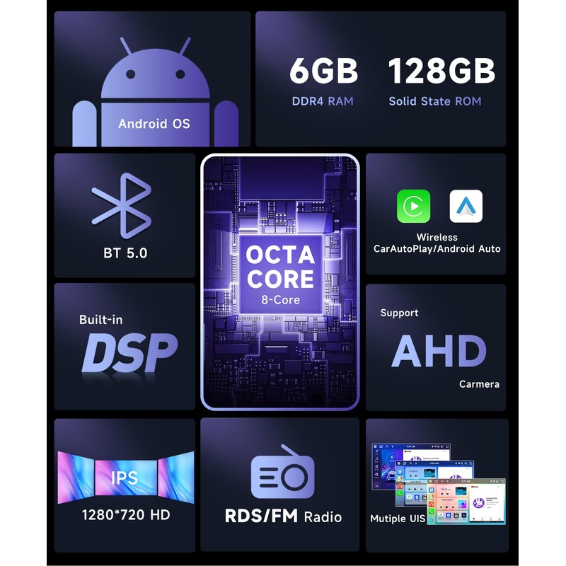- 2.【8Core 6G+128G Android Car Radio Stereo 】 Our Android car stereo with 9inch 1280x720 IPS Touch Screen built-in 8core CUP processer,6G RAM ensures smooth operation and faster response,128 GB ROM for more apps installed.WiFI,On-line surfing Available.Car Stereo allows you install android Apps from Application Store.