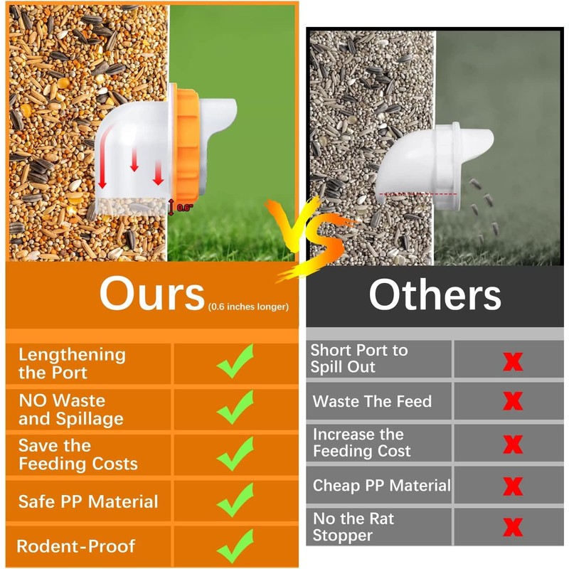 - Upgrade DIY Chicken Feeder: The internal opening of the chicken feeder port has increased by 0.6 inches. This chicken feeder no waste reduces spillage and chaos, saves feed costs, and makes your chicken coop clean and comfortable