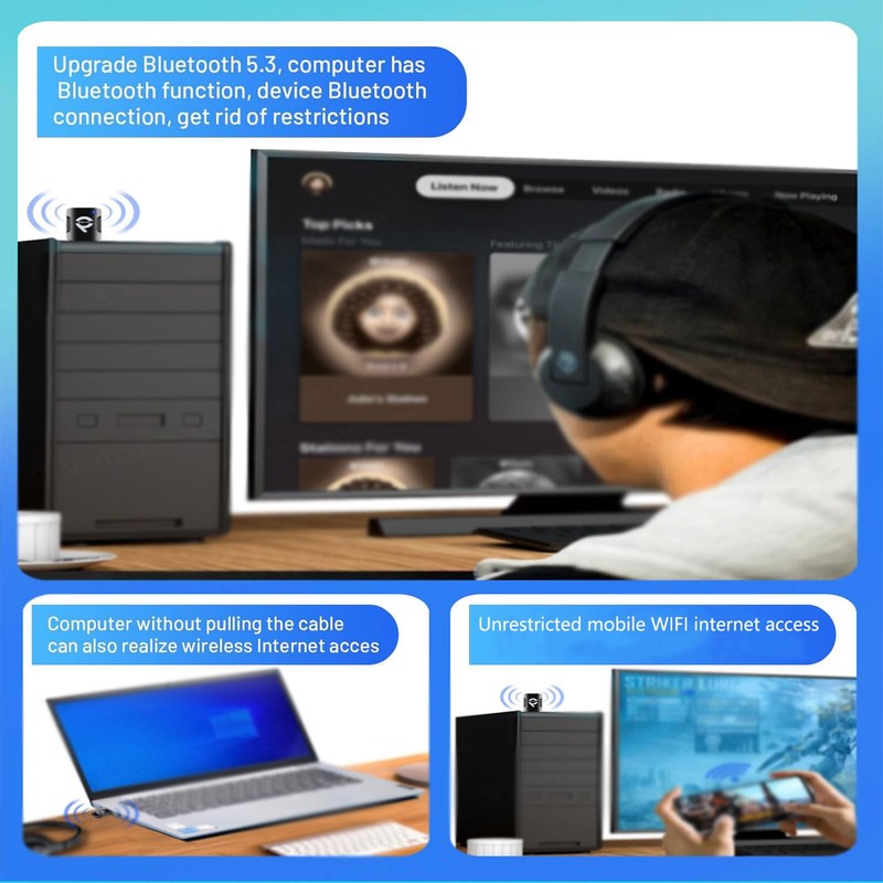 - 【WiFi Bluetooth Adapter 2-in-1】The USB WIFI Bluetooth adapter is a wireless adapter that combines WiFi 6 and Bluetooth 5.3,is backward compatible with previous versions, and supports Wi-Fi reception and AP hotspot sending.