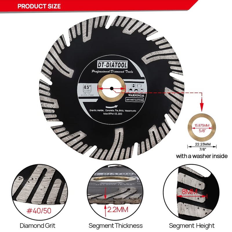 - Size: diameter 115mm, bore 22.23mm, with a washer of 22.23mm-15.875mm. Diamond cutter height: 8 mm. Thickness: 2.2mm Diamond Grit: #40/50