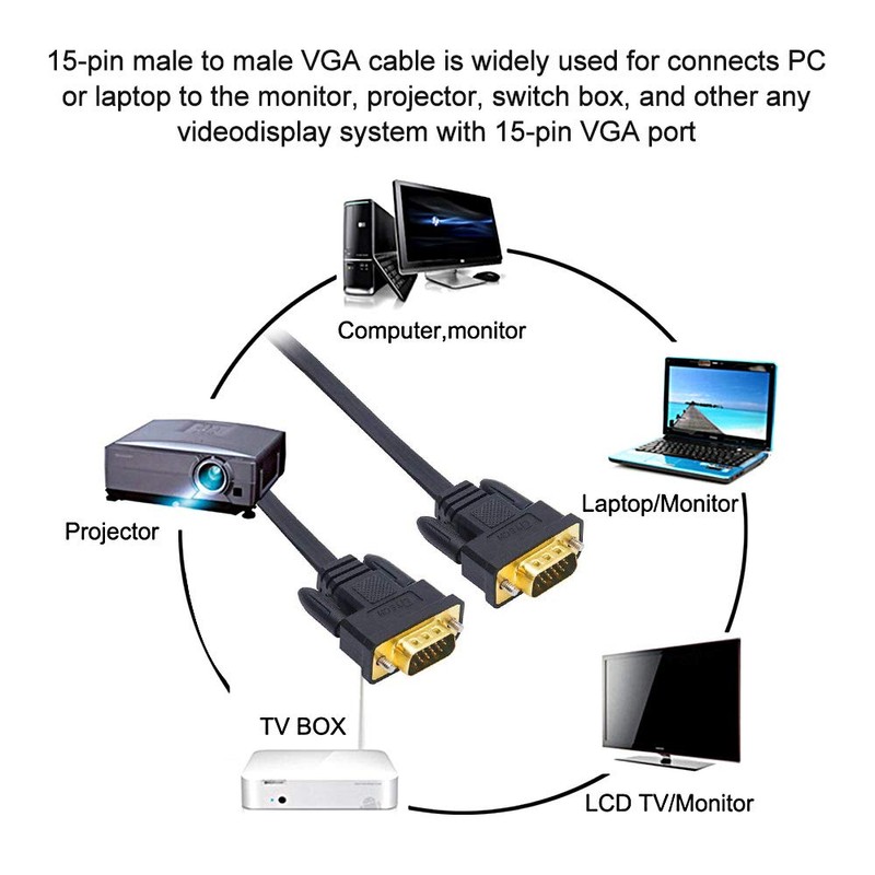 - VGA to VGA cable (male to male) connects a PC or laptop to a monitor, projector, switch box, etc. Any video display system with a 15-pin VGA port
