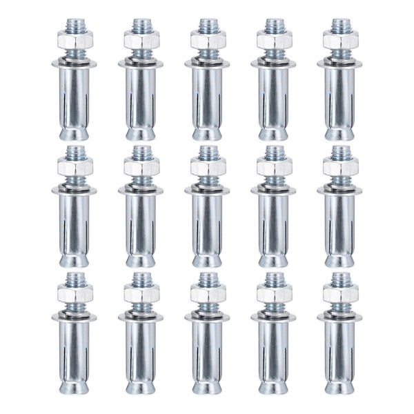 • [Hex Nut Sleeve Anchors] - The package comes with 25pcs of silver carbon steel in nut size 1/2" x 2-1/4", thread size: 9.5 x 29mm/0.37 x 1.14"(D*L), casing length: 44.2mm/1.74", total length: 66.6mm /2.62", nut size: 18.5 x 7.5mm/0.73 x 0.3"(Across Flats D*T), pre-drilled hole diameter: 16mm/0.63", installation torque: 25Ft/Lbs.