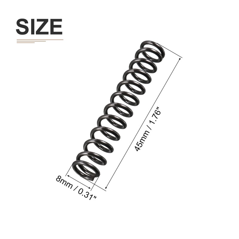 - [Compression Spring]: The package comes with 10pcs of black compression spring in 1.2mm/ 0.05" Wire Dia, 8mm x 45mm/ 0.31" x 1.76" Outer Dia and Free Length.