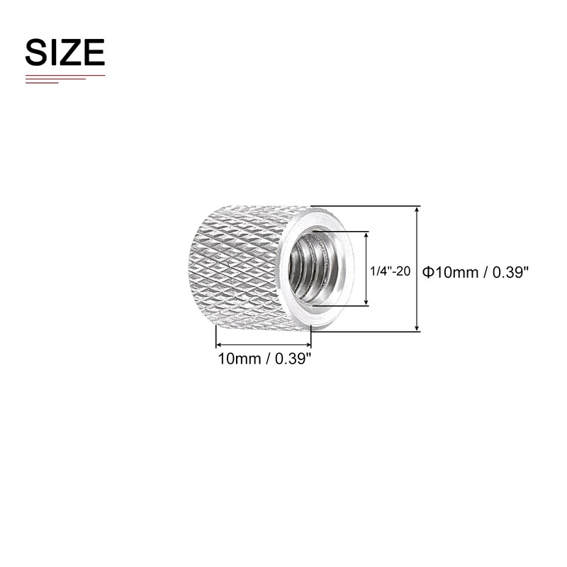 - Tripod nuts: the package contains 4 pieces of black tripod nuts in 1/4 inch - 20 thread size, 10 mm/0.39 inch nut height, 10 mm/0.39 inch outer diameter, and 20 mm/0.79 inch distance
