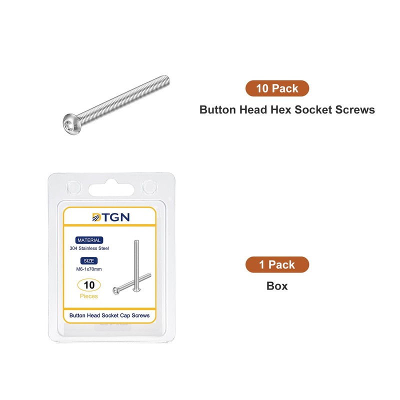 DTGN 10pcs M6-1x70mm Button Head Socket Cap Screw Machine 304 Stainless Steel 18/8 Hex Drive Full Thread Fastener
