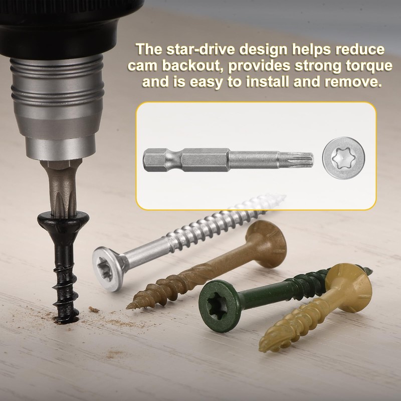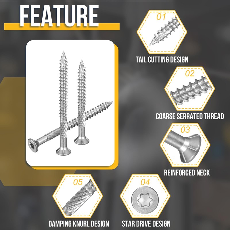 - [Features]: The deck screw’s star-drive design helps reduce cam-out, provides good torque, and ensures a smooth, secure drive. The Type 17 point allows for easier penetration into hardwoods, softwoods, and pressure-treated lumber. Featuring coarse, serrated threads and knurled threads, these screws offer a strong grip and secure hold, helping to minimize board separation and enhance structural stability—making installation quicker and easier.