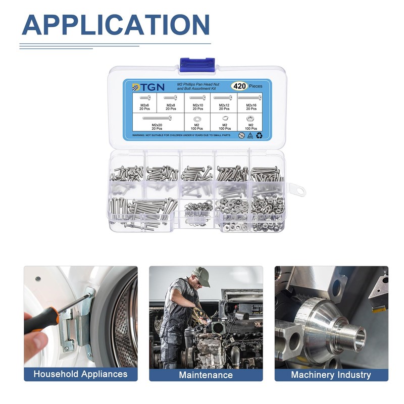 DTGN 420 Pcs Nuts and Bolts Assortment Kit M2 Pan Head Machine Screw 304 Stainless Steel Washer Screw Assortment Kit for Drawer, Cupboard, Closet, Handle