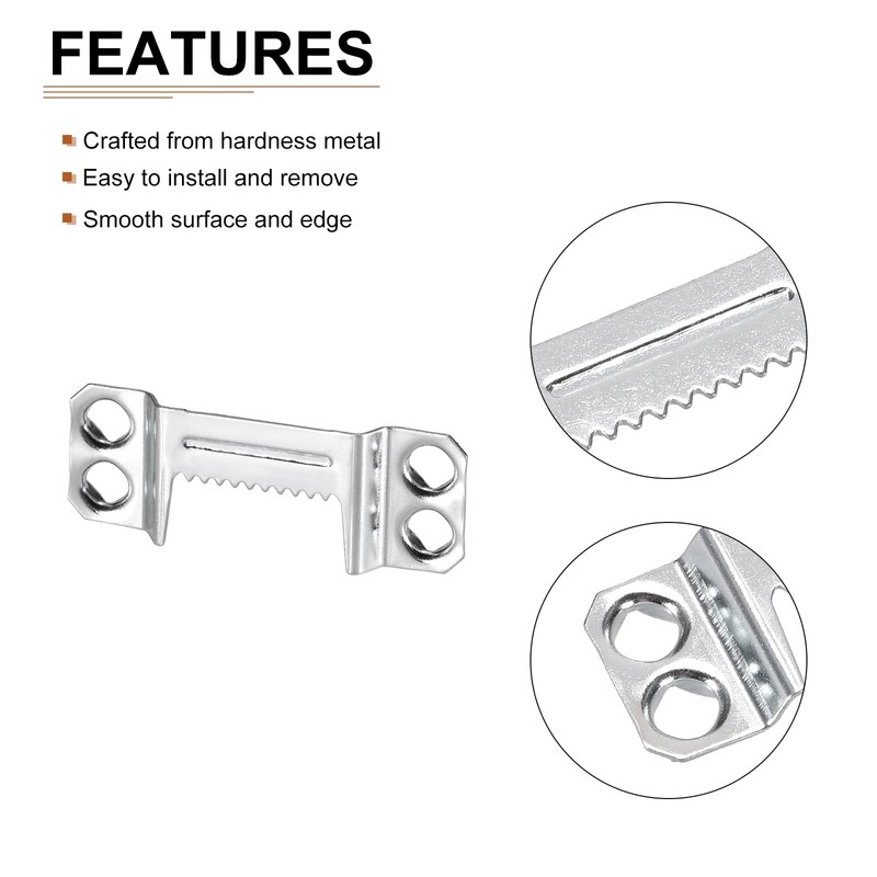 - [Photo Frame Hanger]: The package comes with 20pcs of photo frame hanger. Material: Iron, Finish: Zinc Plated, Thickness: 0.5mm / 0.02", Mounting Hole Diameter: 4.5mm / 0.177", Total Size: 43mm x 16mm x 6mm / 1.69" x 0.63" x 0.24" (LWH), Screw Size (+/-1mm): 3mm x 12mm / 0.12" x 0.47" (Threaded.D*L),