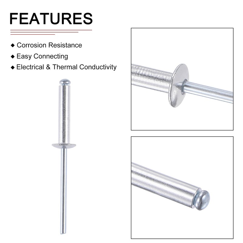 - [Blind Rivets]: The package comes with 120pcs of silver tone open end blind rivets in 4mm/0.16" rivet dia., 20mm/0.79" grip length, 8mm x 1.7mm/0.31" x 0.07"(Dia*T) flange size.