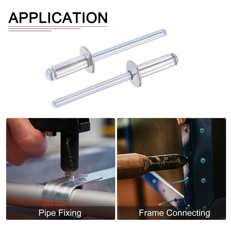 - [GREAT CHOICE]: Blind rivets are very useful for applications that do not get into the back of the fitting (blind side). It is commonly used in a series of materials that create high-strength connections in machinery, furniture, RVs, marine, architecture, etc. Typically, this process is used to connect plastic or metal plates