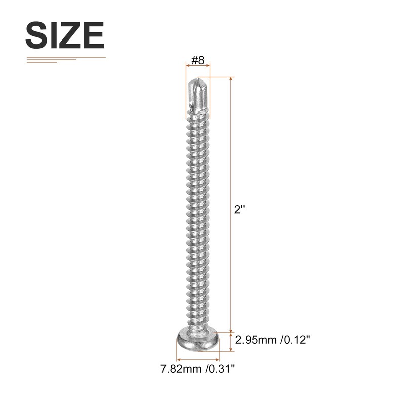- [Phillips Pan Head Self-drilling Screw]: The package comes with 50pcs of self-drilling screw in #8(ST4.2) thread diameter, 2inch(51mm) Thread Length, 7.82mm / 0.31inch Head Dia, 2.95mm / 0.12inch Head Thickness, 1.75-3mm / 0.07inch-0.12inch Screw Drilling Range(Plate Thickness)
