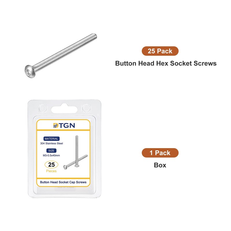 - [Inner Hex Socket Screw]: The package comes with 25 Pcs of full thread coarse thread button head socket screws in Thread Dia: M3, Thread Pitch: 0.5mm/ 0.02", Thread Length: 40mm/ 1.57", Head Dia.: 5.7mm/ 0.22", Head Thickness: 1.65mm/ 0.06"