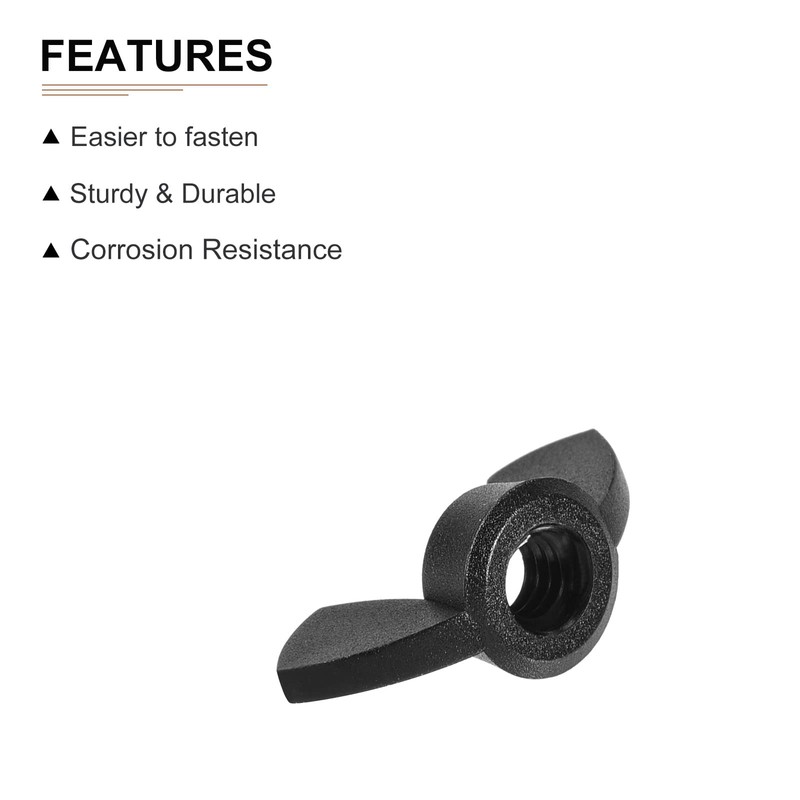 Feature - Butterfly wing nuts have a wing on each side, no sharp edges, and a smooth finish that tighten the nut without tools. The butterfly design of the screw head will increase the lateral bearing surface and makes it easier to fasten.