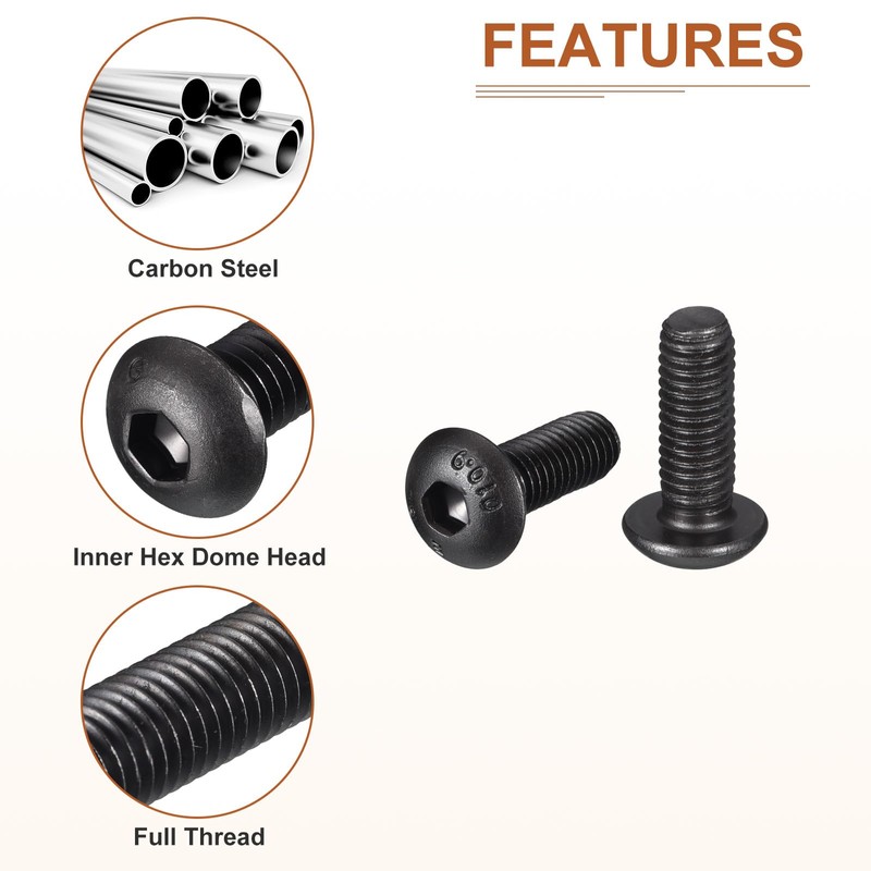 - [Design]: The button socket head cap screw is designed with an inner hex drive style and dome head, providing a higher torque and clamping force, as well as offering a wider bearing surface and high tensile strength.