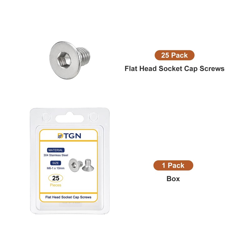 DTGN M6-1 x 10mm Flat Head Socket Cap Screws, 25 Pack 304 Stainless Steel Hex Socket Flat Head Screws, Full Thread, Countersunk Bolts