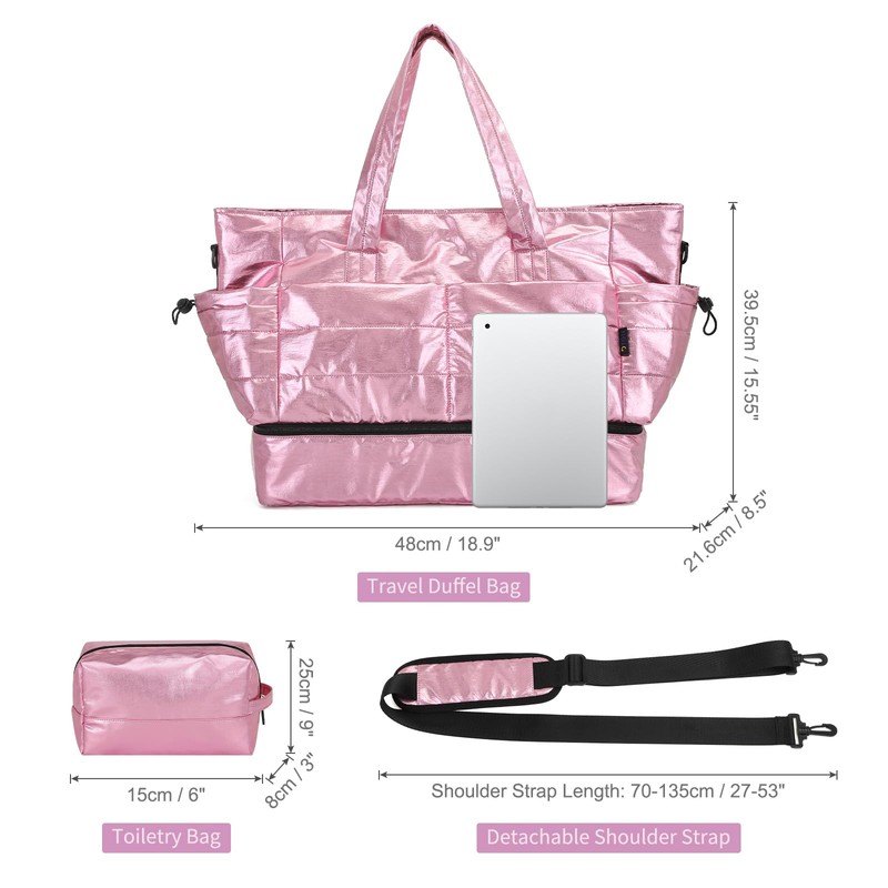 - -Travel Duffel Bag+Seperate Toiletry Bag-- This travel bag with shoe compartment for women comes with a toiletry bag to store your cosmetics/toiletries. The travel bag size is 18.9 x 8.5 x 15.55 inch / 48 x 21.6 x 39.5 cm. The travel bag capacity is 50L. The Toiletry Bag size is 9 x 3 x 6 inch / 25 x 8 x 15 cm. The Hand Strap Height is 11.8 inch / 30 cm. The Shoulder Strap Length is 27-53 inch /70 - 135 cm.