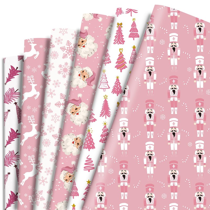 Dtiafu Pink Christmas Wrapping Paper 6 Classic Holiday Style Gift Wrap Paper Bulk Santa Reindeer Nutcracker and Snowflake for Party Baby Shower, 20 X 28 Inches, Folded Flat (6 Sheet)