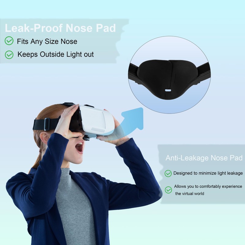 - 【Anti-leakage Nose Pad & Lens Cover】 The leak-proof nose pad is made of soft material and fits any size nose. It blocks outside light from entering, allowing for a more immersive gaming experience. Additionally, when not using your VR device, you can use the lens protector pad to cover your lens from everyday scratches and scrapes