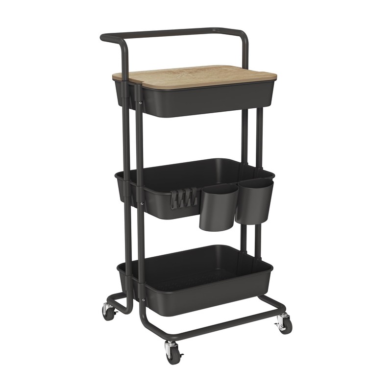 DTK 3 Tier Utility Rolling Storage Cart with Cover Board, Handle and Locking Wheels, 2 Small Baskets and 4 Hooks for Bathroom Office Balcony Living Room(Black)
