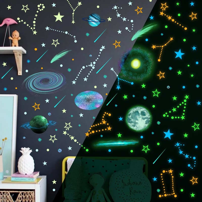 - Application: Creative diy art vinyl removable wall decal are suitable for kids baby children's bedrooms, bedroom, living rooms, nursery, library, classrooms, daycare, playrooms and common areas that children like. Glow in the dark ceiling galaxy wallpaper stick and peel is also very suitable for smooth surfaces such as bathrooms, kitchens, doors and rooms, furniture, etc. And no matter where you like, if the wall is not very smooth, you can use some double-sided tape to make it stronge.