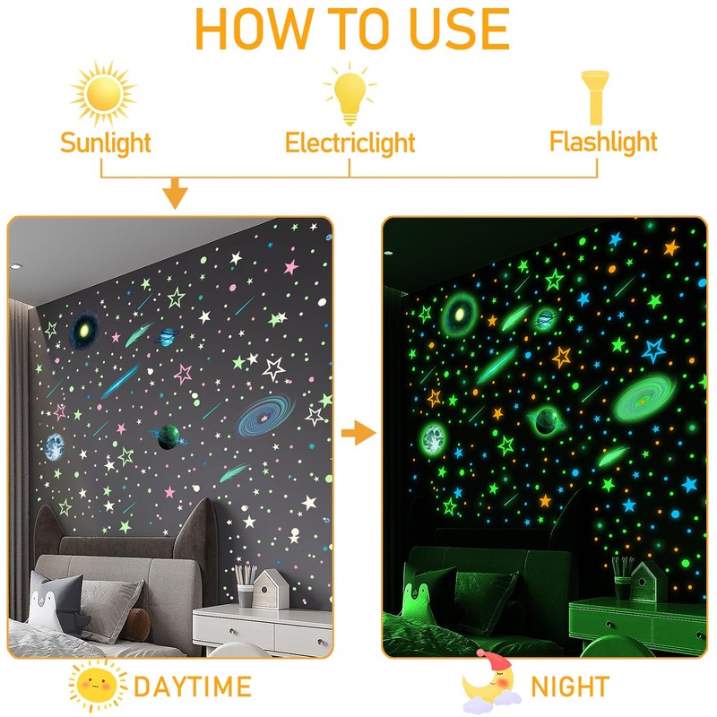 - Easy To Use: Glow in the dark 3d space wall decals, you just need to put them under sunlight,room light or flashlight for 15 mins. At night, turn off the light, kids will see these ceiling stickers glowing soft green, blue, and orange light in their room, our moon and star decals are beautiful,very realistic and glow like crazy,the brightness depends on the light it absorbs. The longer it is placed under a strong light, the brighter the light is, and the longer the stars for ceiling continues to glow in the dark.