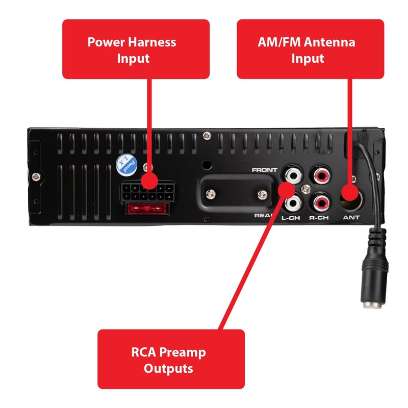 - Front 3.5mm AUX input, USB port with 1A charging & MP3 playback