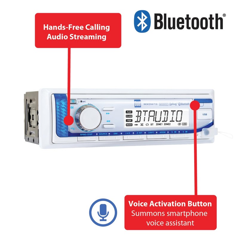 - BLUETOOTH WIRELESS TECHNOLOGY – your single DIN marine stereo head unit receiver will easily pair with the vast majority of Bluetooth devices allowing you to make and receive all your calls Hands Free in addition to streaming all your favorite music