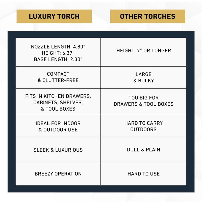 - A Luxurious Gift They Can’t Beat: Available in 5 sophisticated colors, our handheld kitchen torch for baking boasts a portable, sleek design that will look fantastic on your shelf or cabinet. This butane cocktail torch also comes in a deluxe gift box, making it a beautiful present to your fellow creatives.